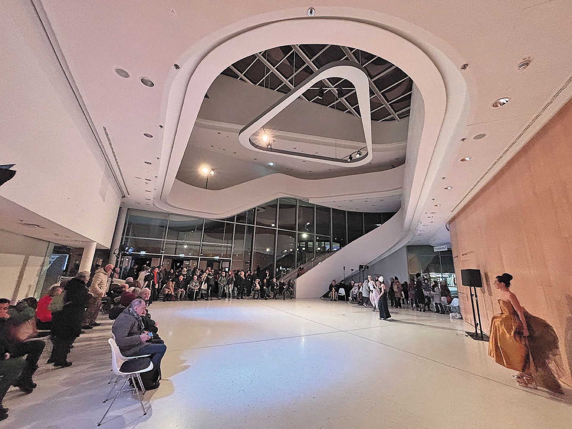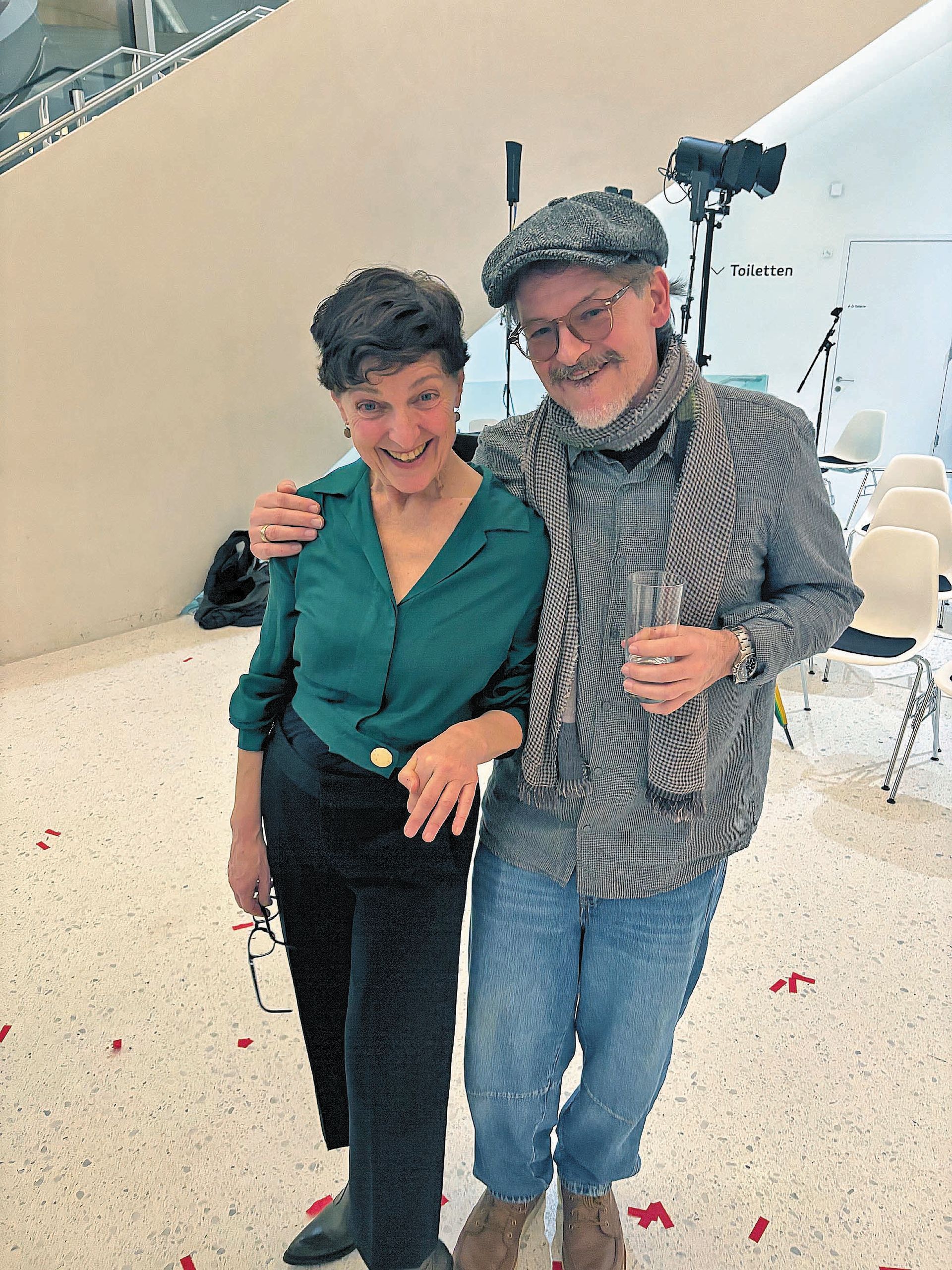 Das Montforthaus selbst wurde Teil der Inszenierung. Die markante Glasfassade mit ihren Blickachsen von außen nach innen und von innen nach außen wurde dramaturgisch genutzt. Das Haus war nicht länger bloß Austragungsort, sondern agierte als Mitspieler. Architektur und Theater gingen eine Verbindung ein, wie sie einem Kulturhaus dieses Formats würdig sind. Ein Bau unserer Zeit durfte zeigen, was er sein kann: offen, transparent, strahlend – ein Ort lebendiger Kultur. Zwar wurde das Montforthaus schon bei den Montforter Zwischentönen gerne für „mehr“ verwendet, Walk aber war mit dieser Aufführung gezielt darauf aus, auch das Haus selbst in den Mittelpunkt zu stellen.