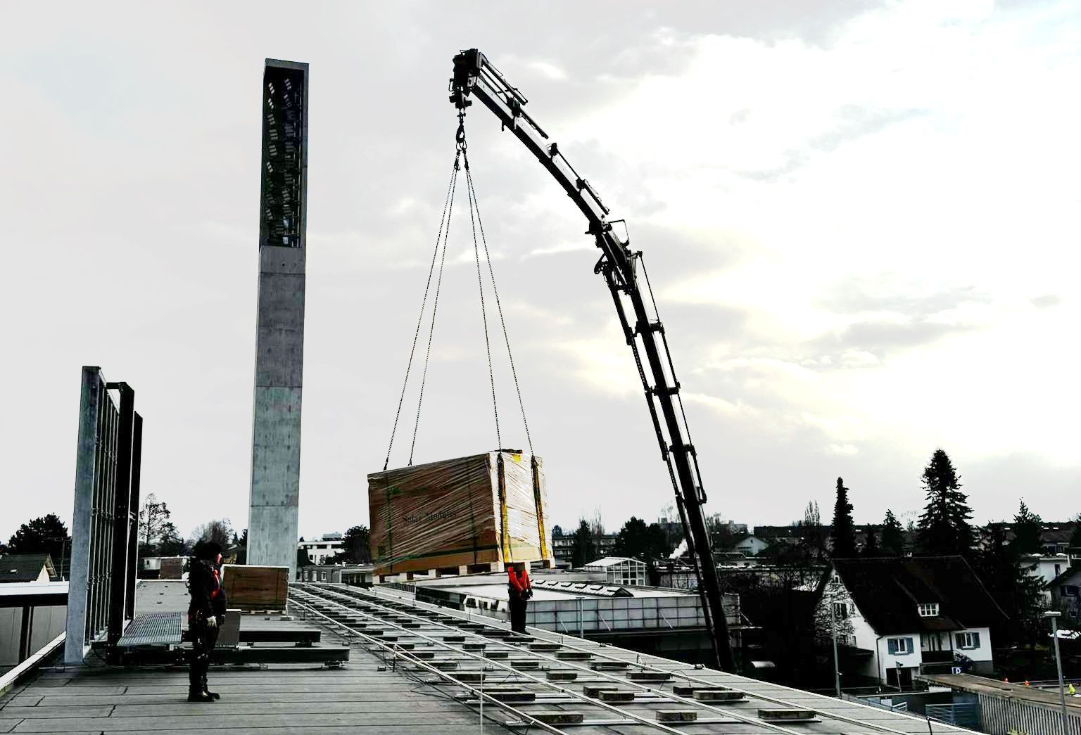 Zwölf Paletten Solarmodule und sieben Tonnen Adjustierungssteine wurden per Spezialkran aufs Dach gehievt, 140 Module wurden an einem Tag installiert und die längste Leitung zieht sich über 250 Meter bis in den Technikraum. An sonnigen Wintertagen produziert die Anlage rund 650 Kilowattstunden, im Sommer bis zu viermal so viel – jährlich etwa 210.000 Kilowattstunden. Vier Wechselrichter wandeln den Gleichstrom in nutzbaren Wechselstrom um.